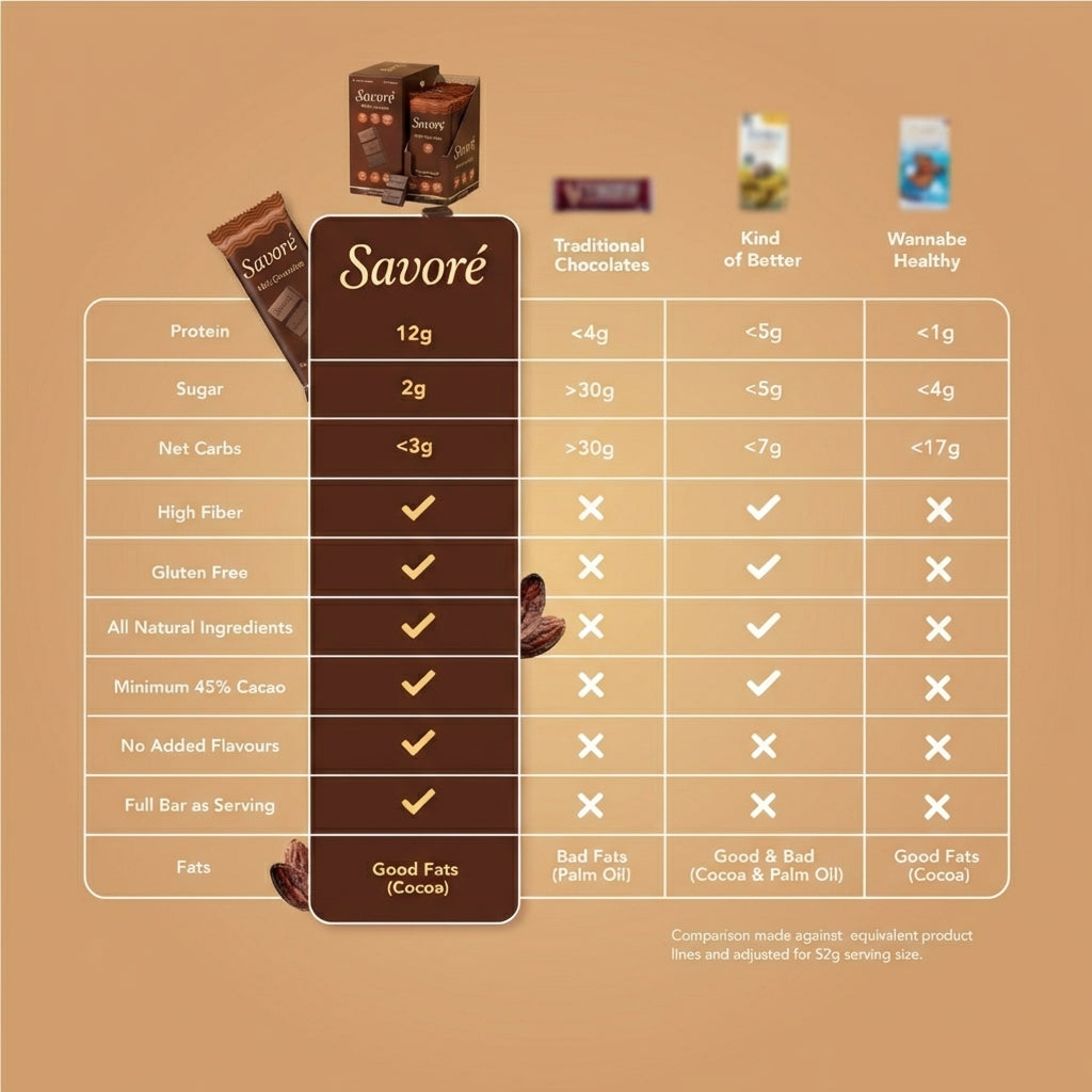 Savoré™ brings the two together — real chocolate, thoughtful ingredients, and balanced nutrition. No extremes. No gimmicks. Just better chocolate you can enjoy more often.